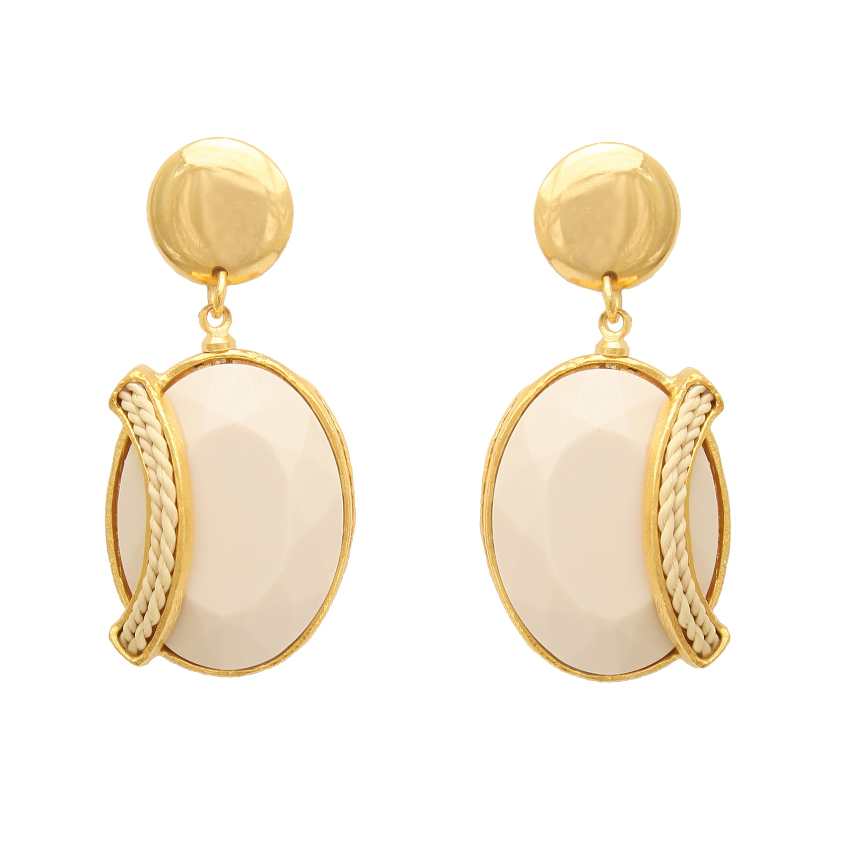 Aretes laterra redondos con cristal hexagonal blanco combinado su diseño con fibra natural.