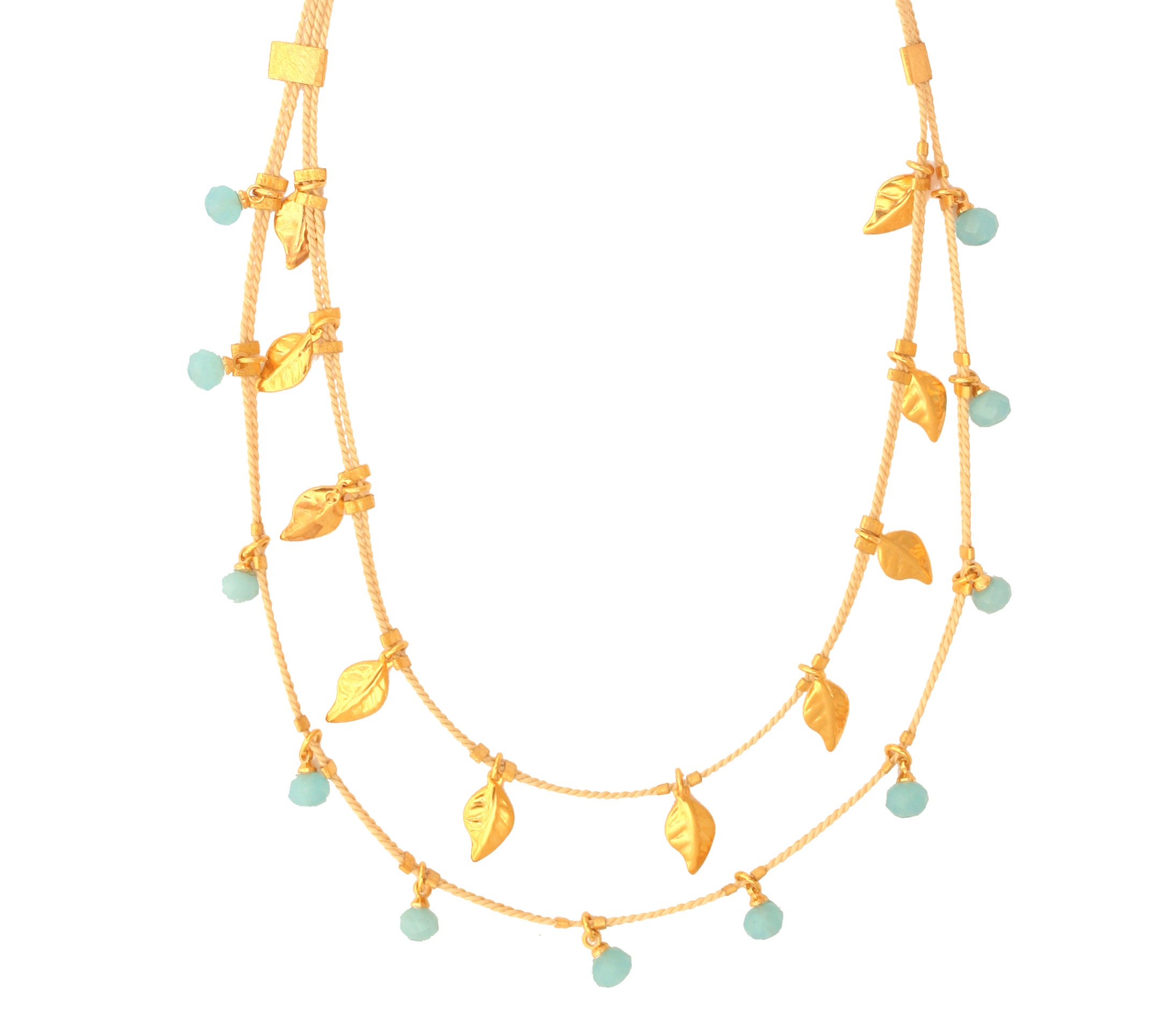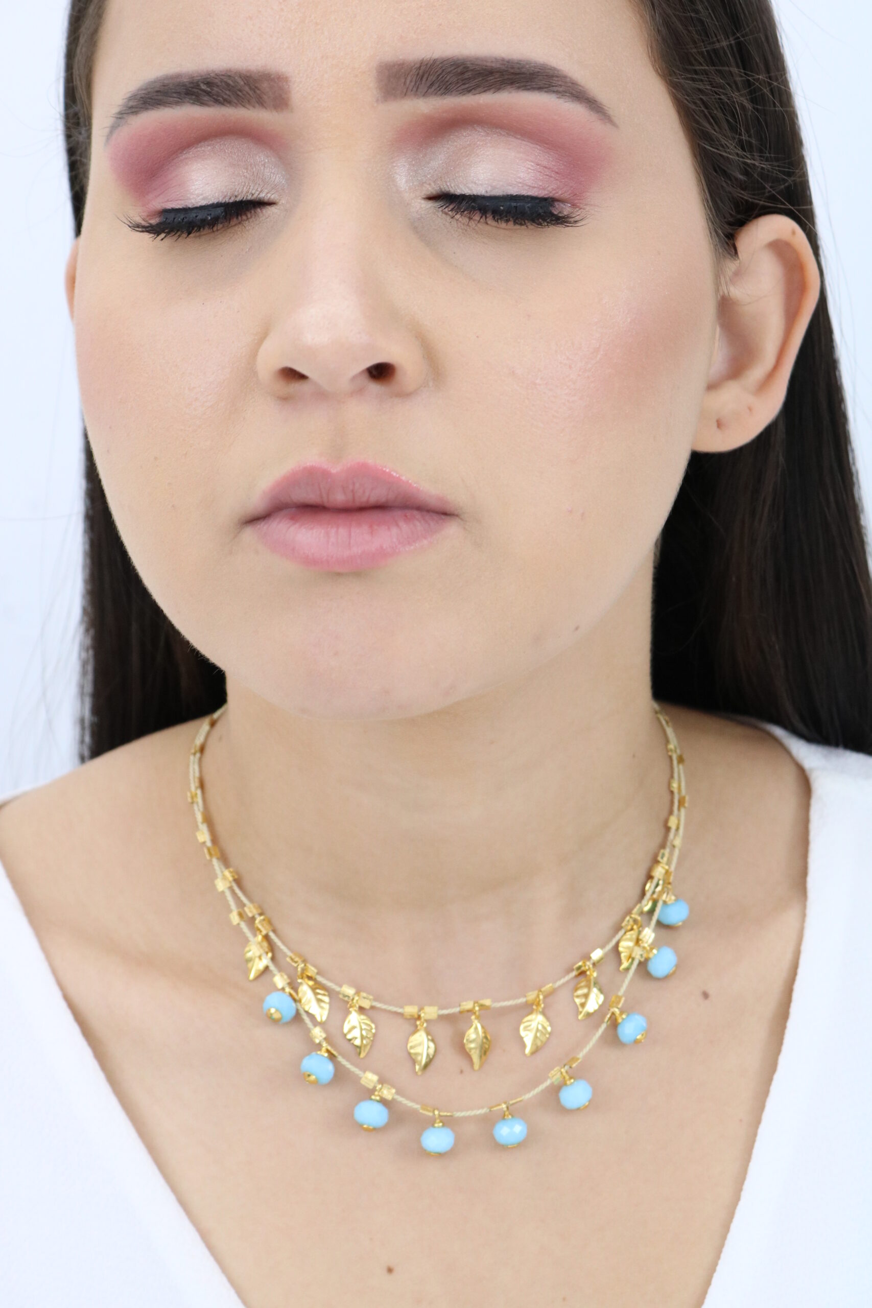 Collar layering cristal turqueza y hojas combinado con fibra natural.